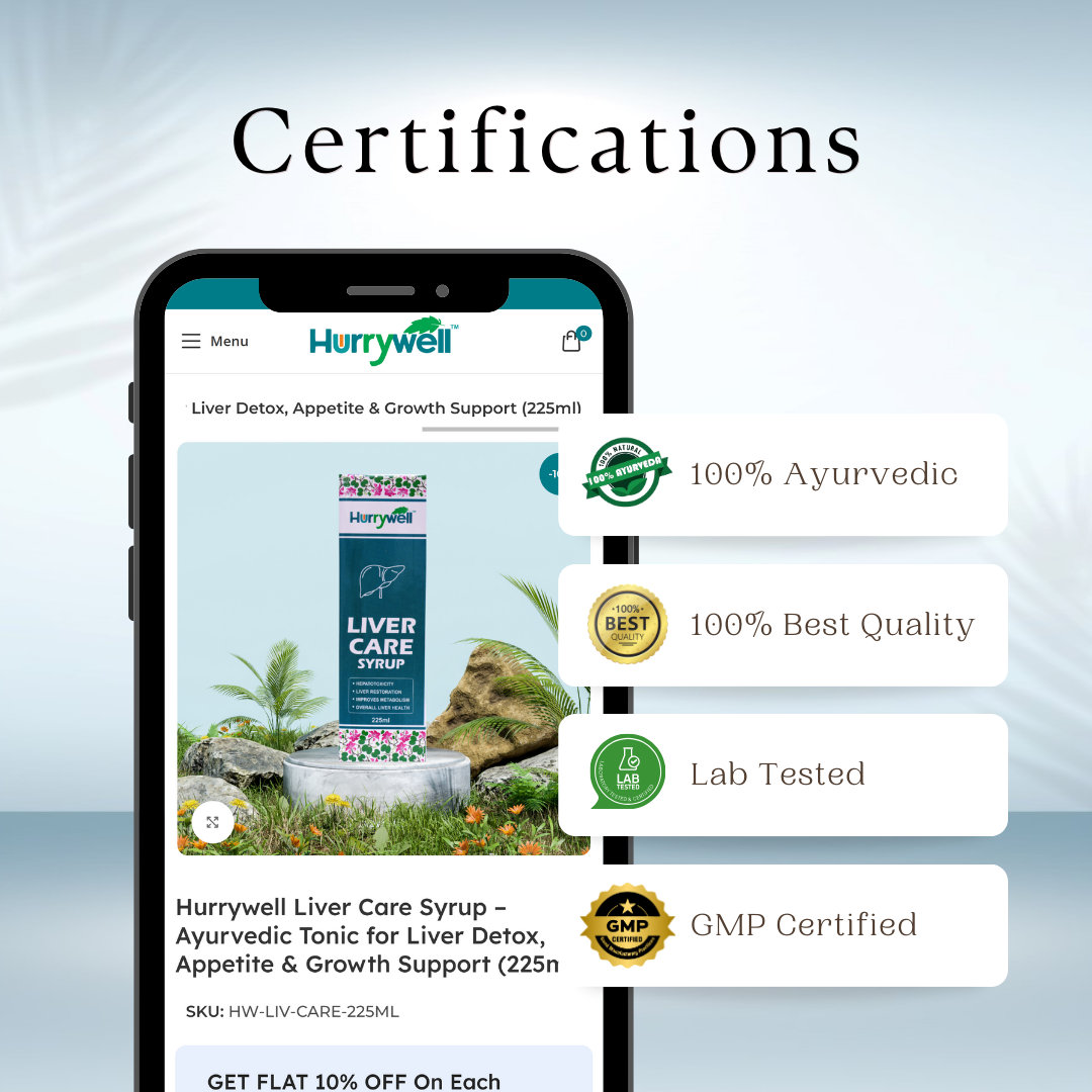 Crafted with ancient Ayurvedic wisdom and modern GMP standards, Hurrywell Liver Care Syrup is safe, effective, and ideal for daily liver maintenance.
